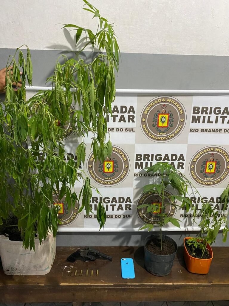 No decorrer da abordagem, os agentes realizaram buscas no pátio da casa e localizaram três pés de maconha plantados no local.