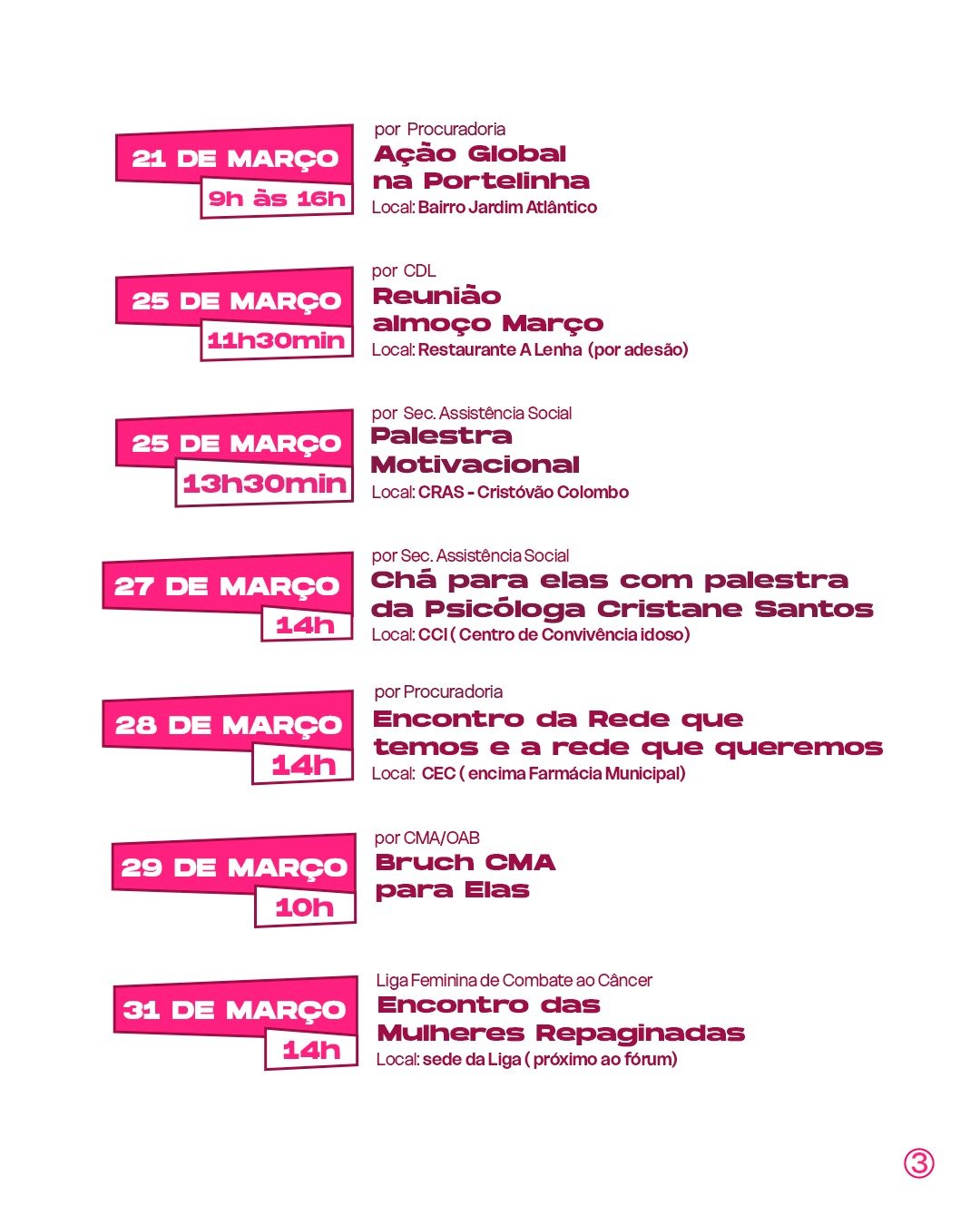 Entre as atividades programadas estão exposições, palestras, atendimentos especializados e ações esportivas e culturais, todas com o intuito de promover o protagonismo feminino e incentivar o empoderamento das mulheres, além de reforçar a rede de proteção e conscientização sobre seus direitos.