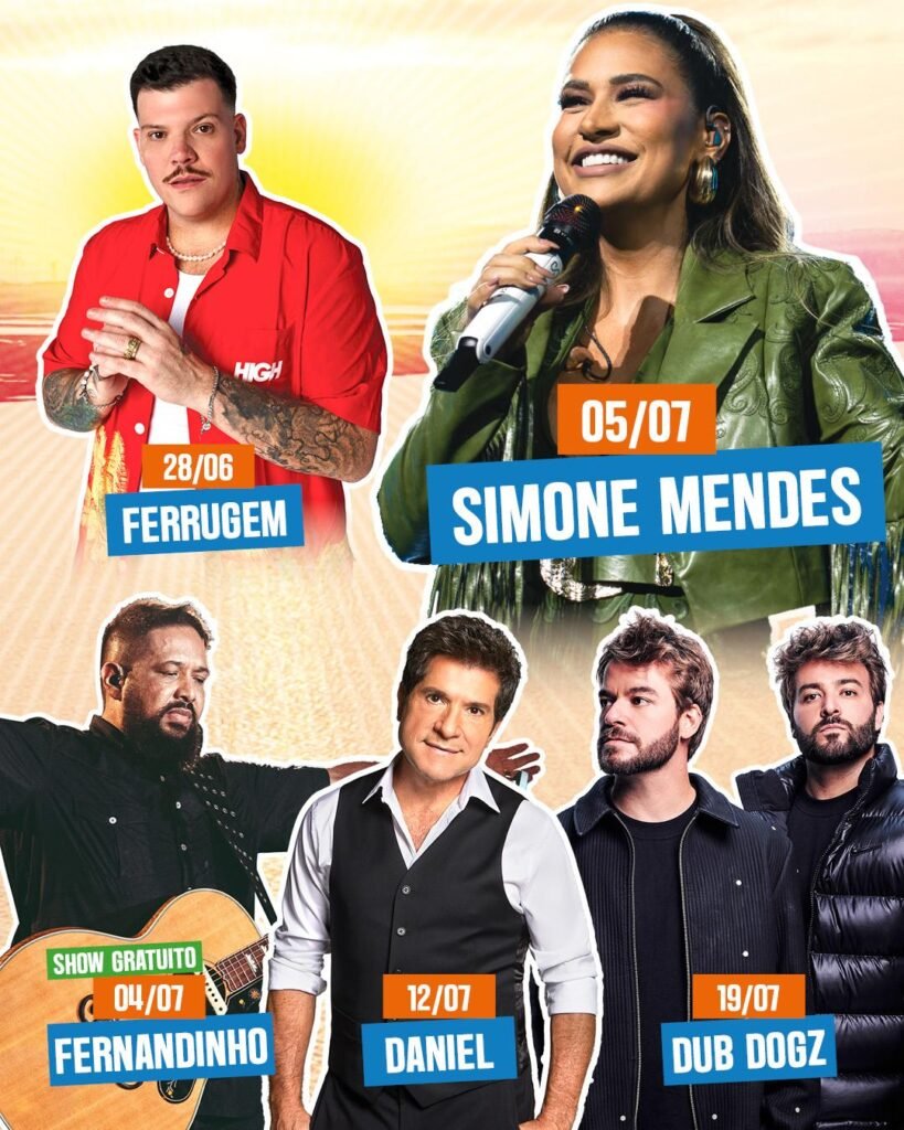 A programação musical inclui apresentações nacionais de destaque. Entre os principais nomes estão Ferrugem (28/06), Fernandinho (04/07, com entrada gratuita), Simone Mendes (05/07), Daniel (12/07) e DubDogz (19/07).