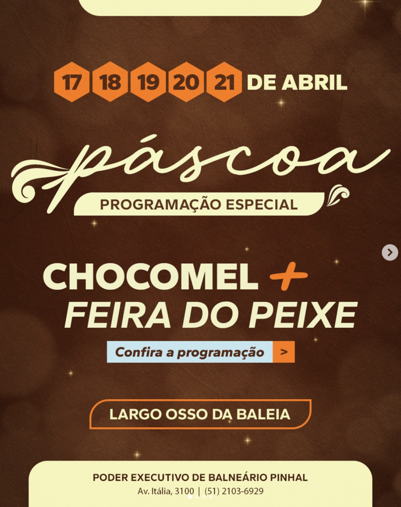 Balneário Pinhal dá início, nesta quinta-feira (17), a mais uma edição da tradicional Chocomel e Feira do Peixe, evento que integra as comemorações de Páscoa no município do Litoral Norte gaúcho. As atrações ocorrem até segunda-feira (21) em diversos pontos da cidade, como a Rua Coberta, Largo Osso da Baleia, no Centro, e no bairro Magistério.