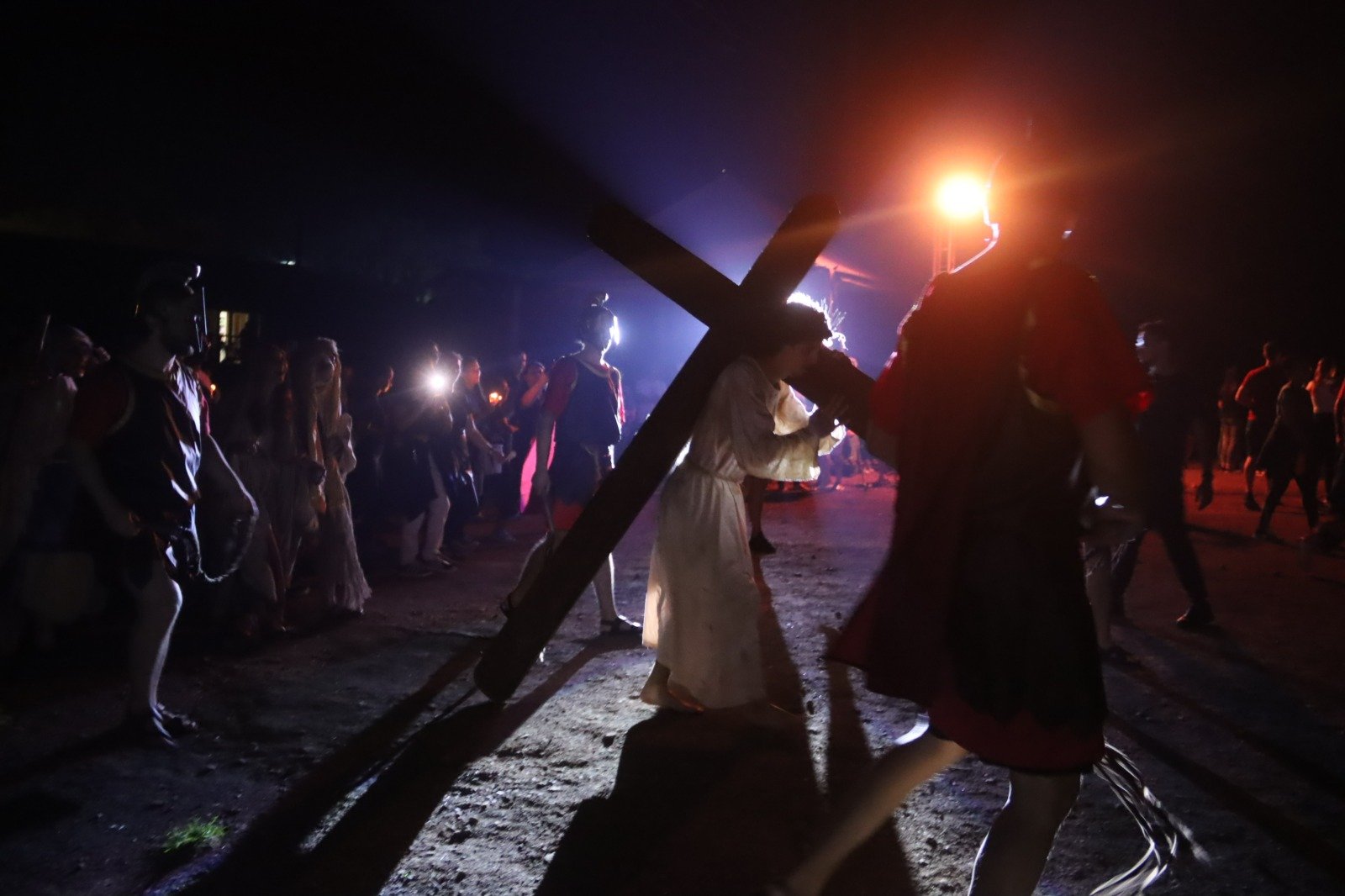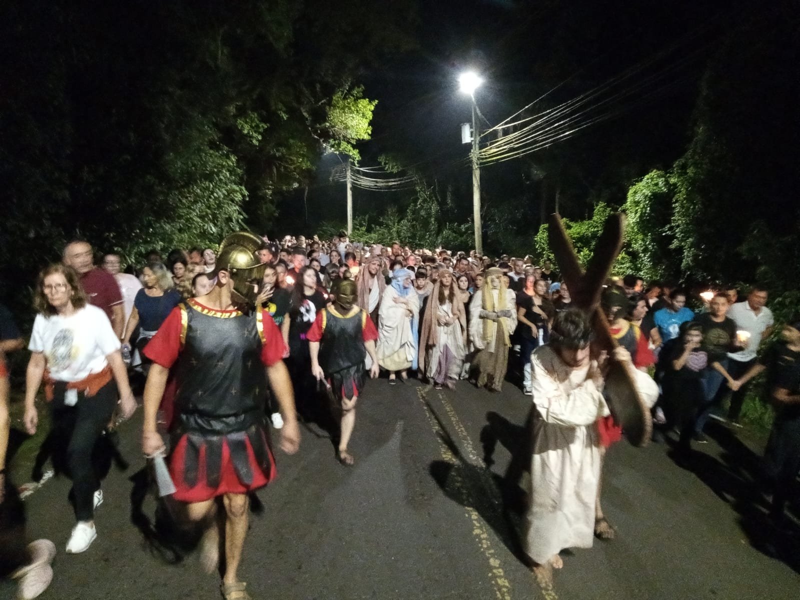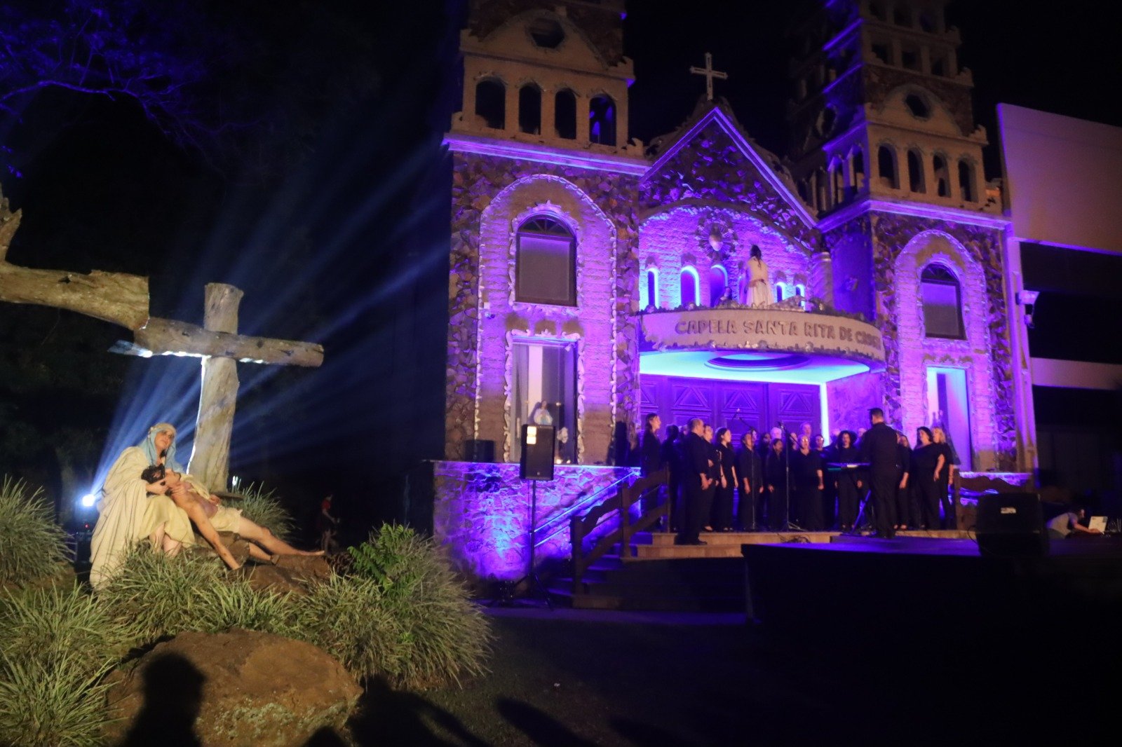 O momento mais esperado aconteceu em frente à igreja, com a finalização do espetáculo “Manhã em Jerusalém”, que dramatizou os últimos momentos de Jesus Cristo — da crucificação à ressurreição. A encenação foi realizada pelo grupo teatral 1º A.T.O., formado por 22 atores, e teve a participação do Coral Municipal de Osório, com cerca de 40 integrantes sob a regência do maestro Douglas Schwantes.