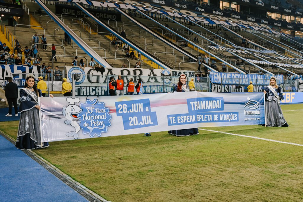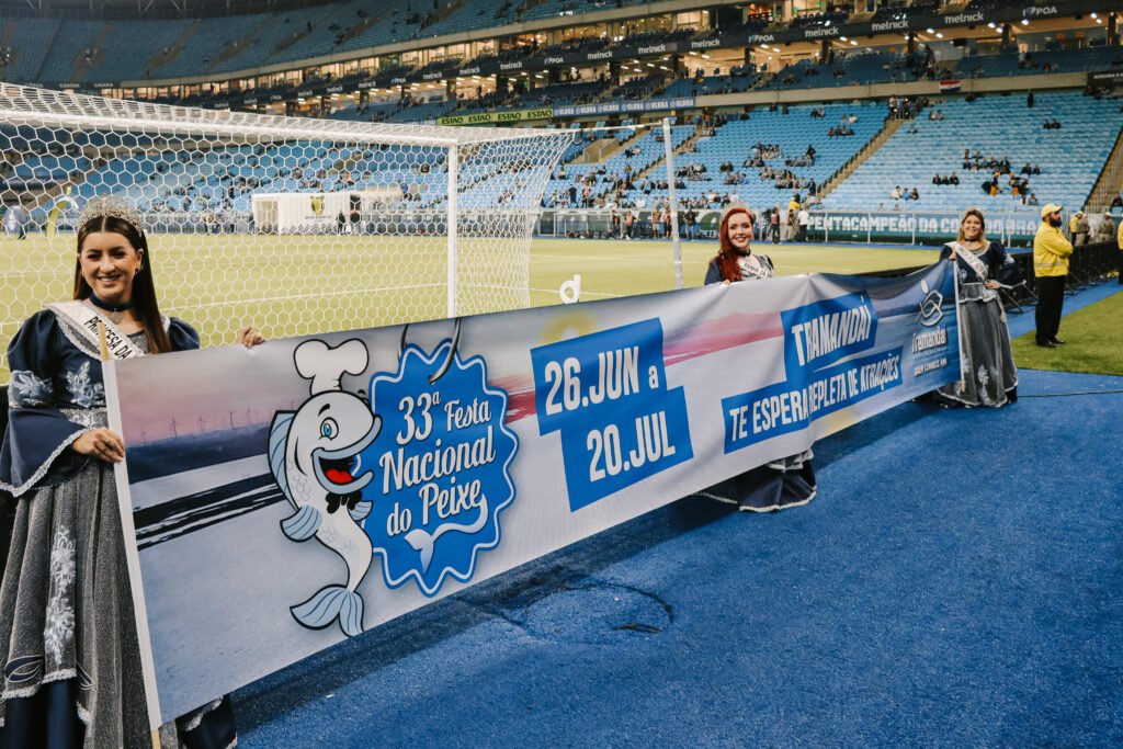 Tramandaí levou sua principal festividade ao centro das atenções do futebol nacional no último sábado (19). Durante o clássico entre Grêmio e Internacional, válido pela 5ª rodada do Campeonato Brasileiro e realizado na Arena do Grêmio, em Porto Alegre, a Prefeitura realizou uma ação de divulgação da 33ª edição da Festa Nacional do Peixe.