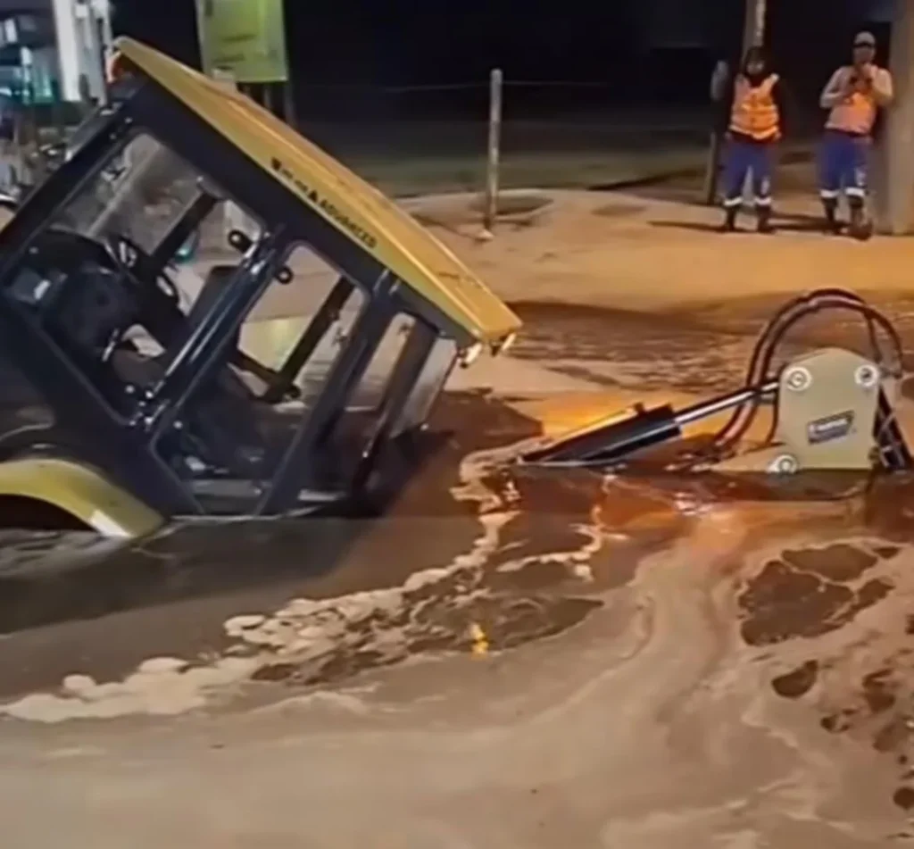 Um rompimento em uma rede de água de grande porte provocou um acidente com uma retroescavadeira e deixou diversos bairros de Capão da Canoa sem abastecimento, no início da noite desta segunda-feira (12). O incidente ocorreu na Rua Ceci, esquina com a Avenida Central, no Centro do município, durante uma perfuração para instalação de rede de telefonia realizada por uma empresa terceirizada. O asfalto cedeu e uma máquina que operava no local acabou deslizando, o que dificultou o acesso inicial para os reparos.