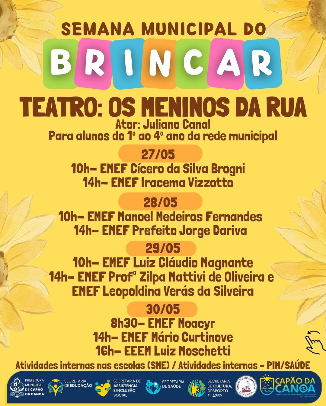 Entre os dias 24 e 31 de maio, Capão da Canoa promove a Semana Municipal do Brincar, uma iniciativa dedicada à promoção do direito das crianças ao brincar, com uma agenda diversificada de atividades lúdicas, culturais e educativas. Com o tema “Proteger o encantamento das infâncias”, a programação busca reforçar a importância do brincar no desenvolvimento infantil, estimulando a imaginação, a criatividade e os vínculos sociais.