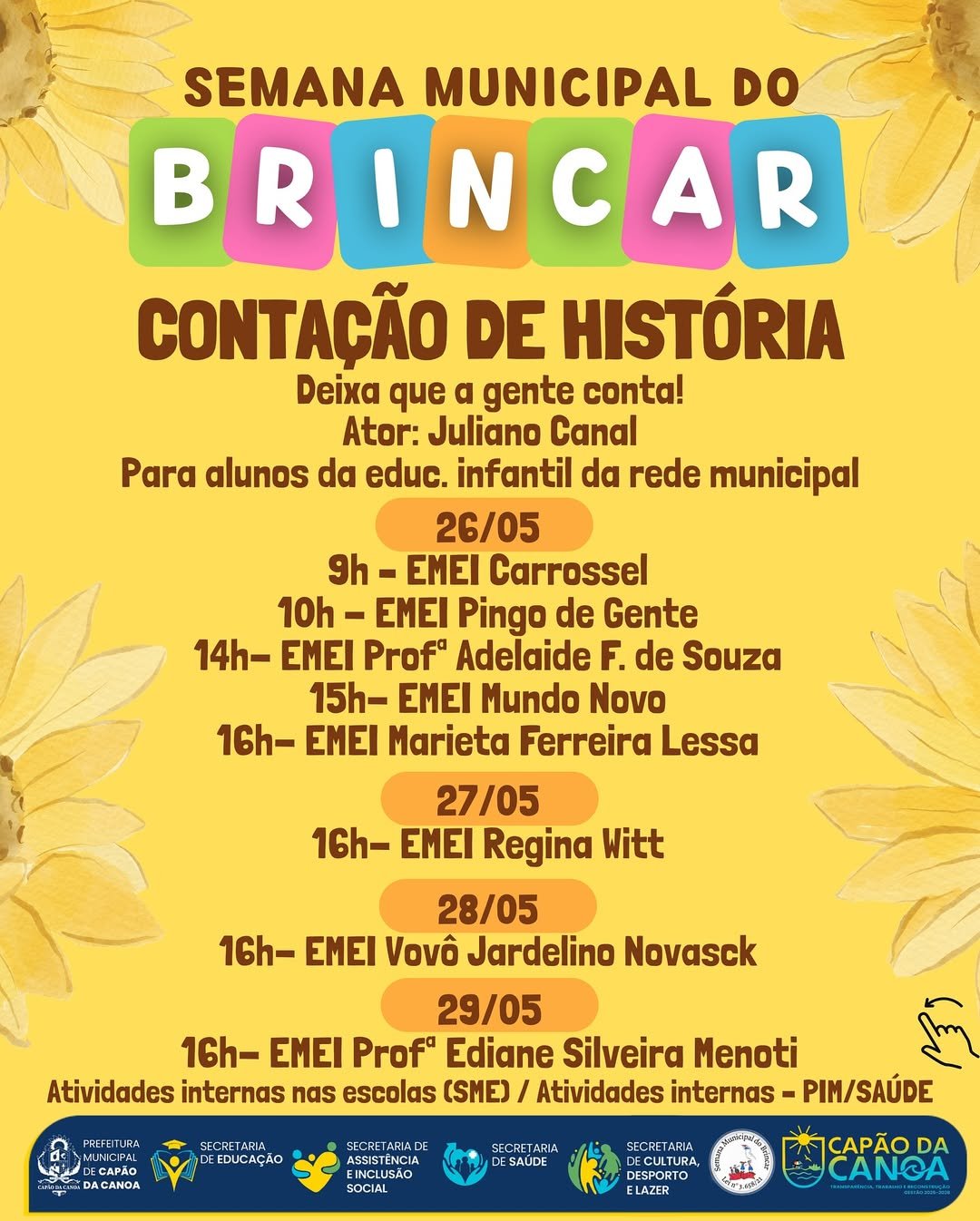 A Semana Municipal do Brincar integra o calendário de ações de Capão da Canoa voltadas à proteção e valorização das infâncias, mobilizando famílias, escolas e comunidade para refletir sobre o papel fundamental do brincar na construção de uma infância plena e saudável. A programação completa está disponível nos canais oficiais da Prefeitura.