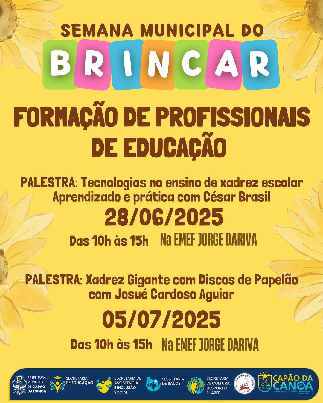 Além das atividades voltadas ao público infantil, a programação contempla também a formação de profissionais da educação, com encontros agendados para os dias 28 de junho e 5 de julho, reforçando o compromisso do município com a qualificação das práticas pedagógicas voltadas à infância.