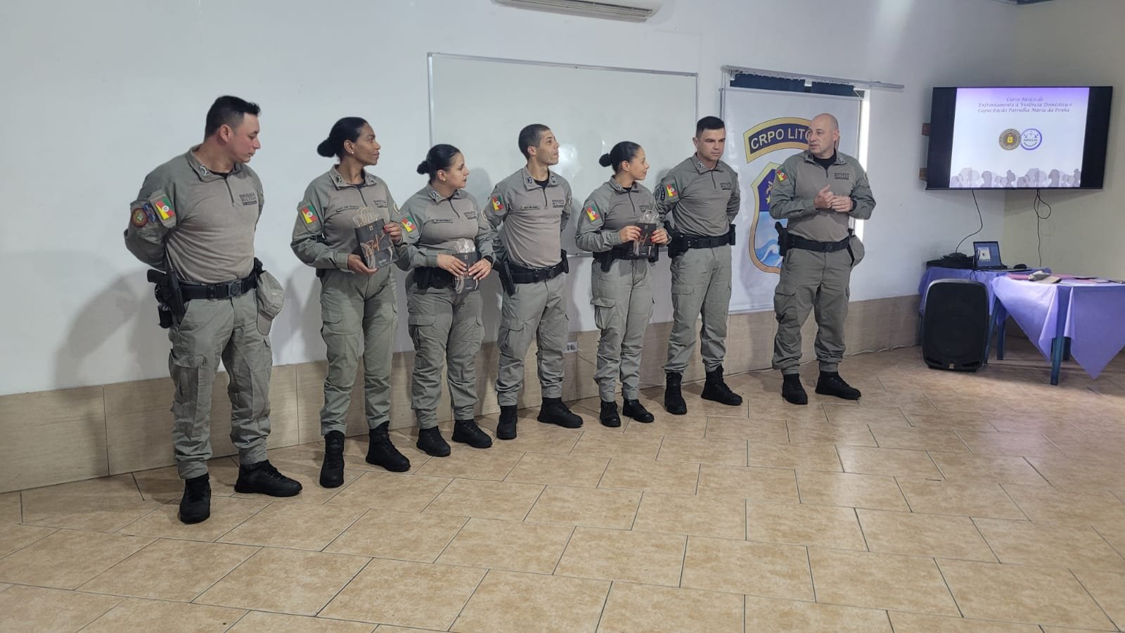 Durante três dias de atividades, soldados e sargentos do 8º Batalhão de Polícia Militar (8º BPM), do 2º Batalhão de Policiamento em Áreas Turísticas (2º BPAT) e da Escola de Formação e Especialização de Soldados (EsFES/Osório) receberam capacitação teórica e prática para atuação especializada no enfrentamento à violência doméstica e de gênero.