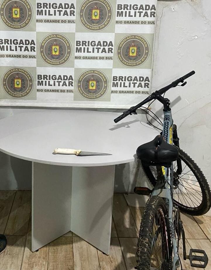 Durante a abordagem, os policiais apreenderam a bicicleta utilizada na fuga e a faca supostamente usada no crime. A vítima sofreu lesões leves, apresentando escoriações nas mãos e no joelho.