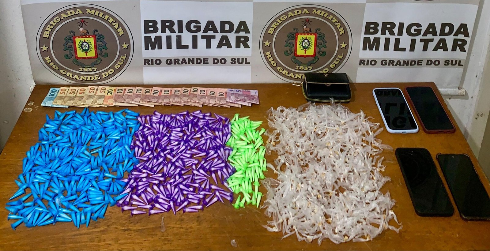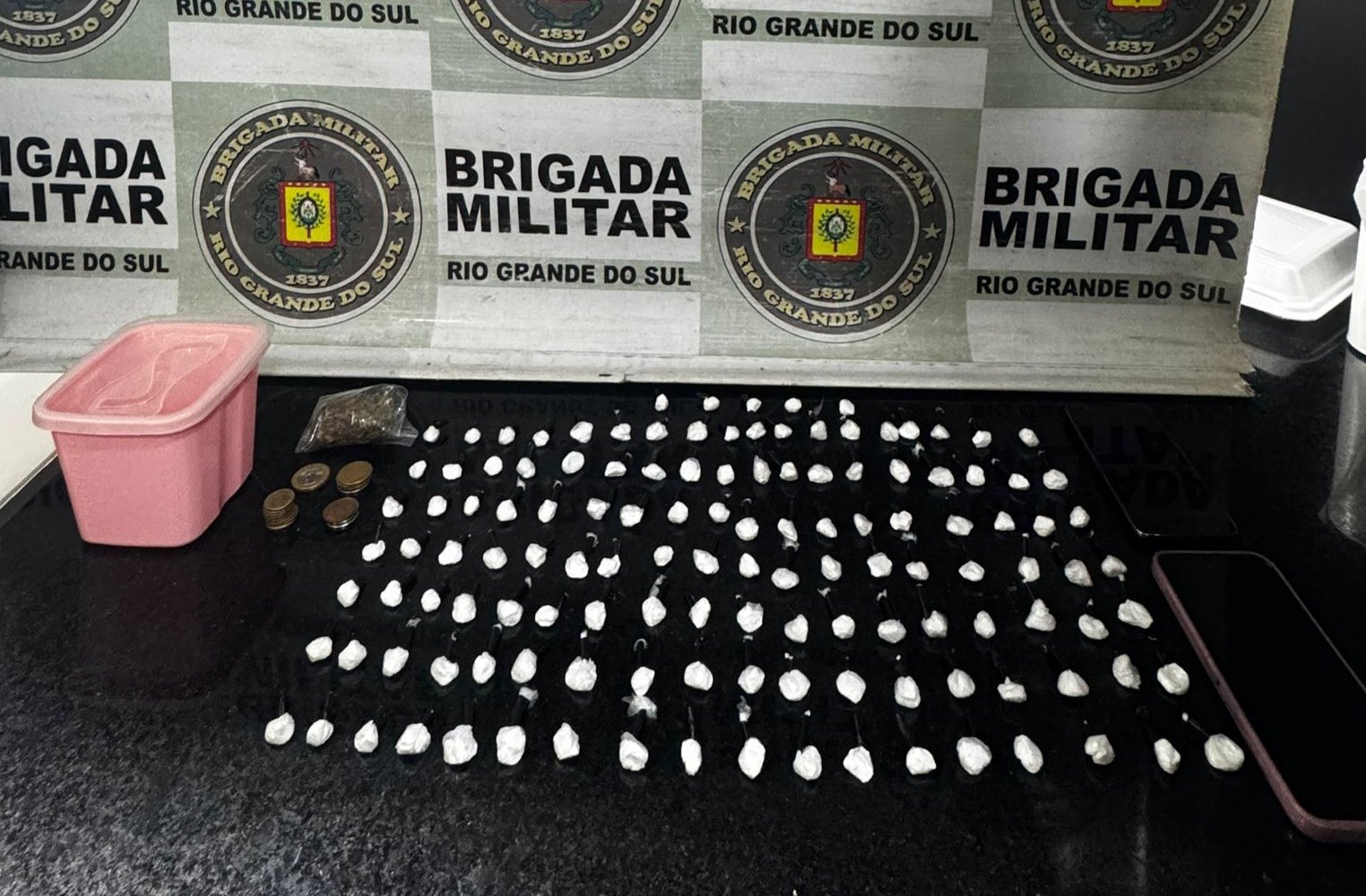Já na ERS-786, na direção de Cidreira, policiais abordaram um veículo com quatro ocupantes. Durante a revista, foram localizados 583 pinos de cocaína, 352 pedras de crack, R$ 500 em espécie e quatro celulares. Todos os ocupantes já possuíam antecedentes criminais.