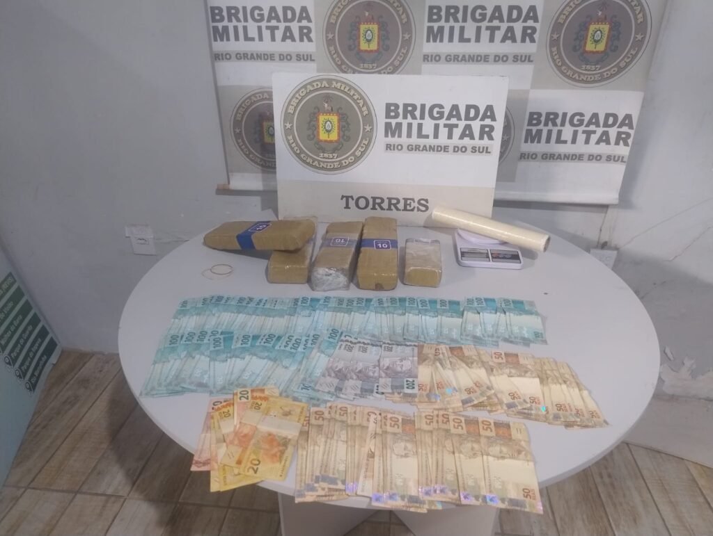 No município de Torres, a guarnição foi acionada para uma ocorrência de violência doméstica. Durante a abordagem ao suspeito, os policiais localizaram quatro tijolos e meio de maconha e uma quantia de R$15 mil em dinheiro.