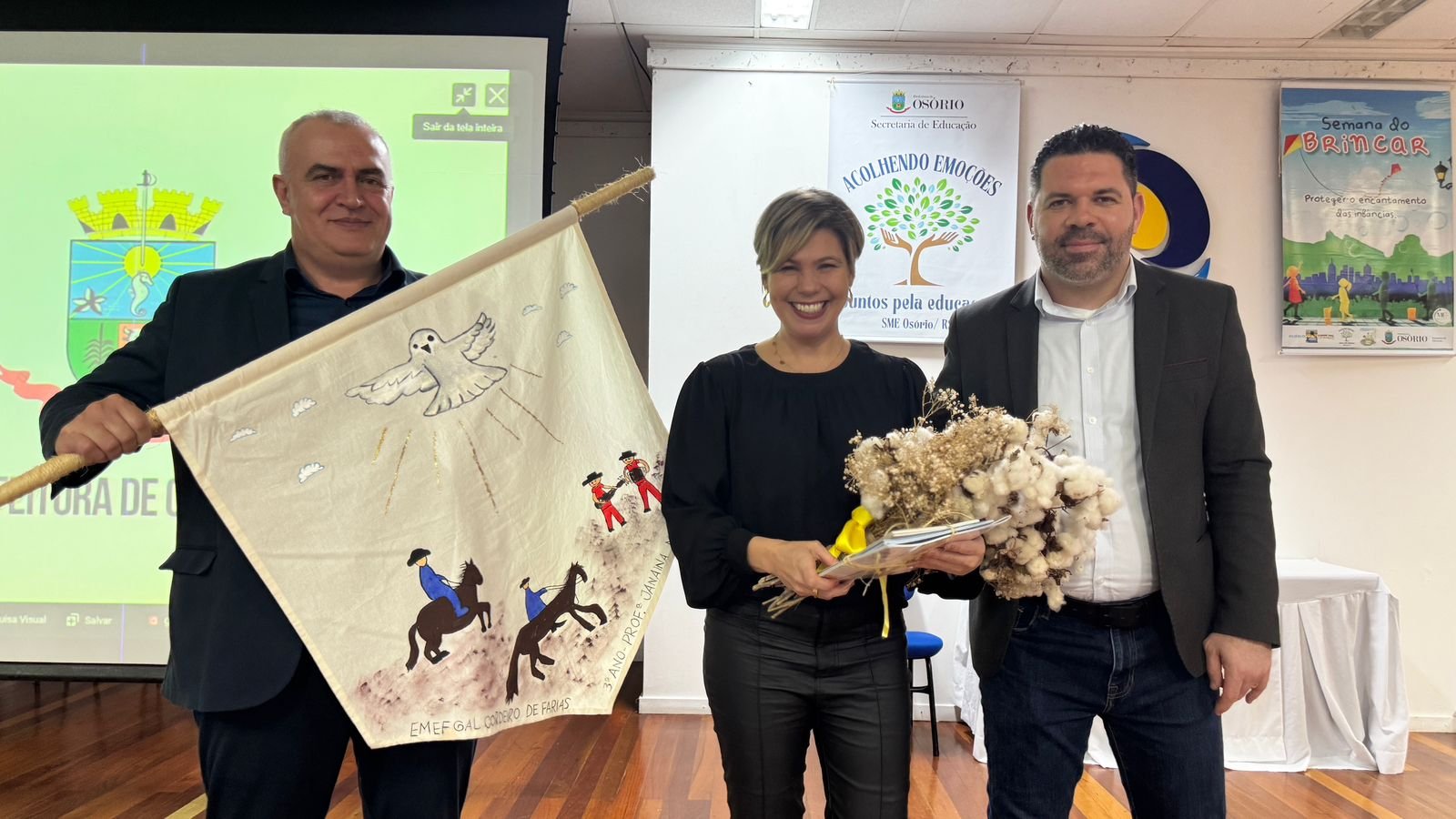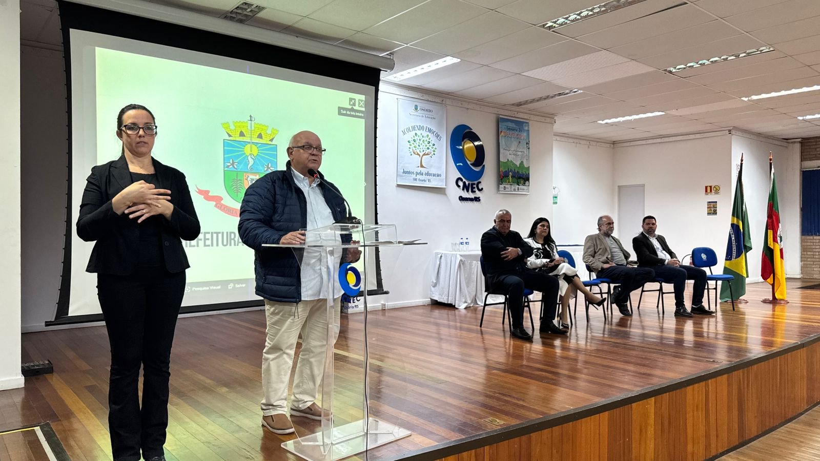 A cerimônia contou com a presença de autoridades municipais, entre elas o prefeito Romildo Bolzan Júnior, o vice-prefeito Ed Moraes, o presidente da Câmara de Vereadores, Rossano Teixeira, a reitora da Unicnec, Ludinara Scheffel, o secretário municipal de Educação, Marcelo Reis, além de professores e comunidade escolar.