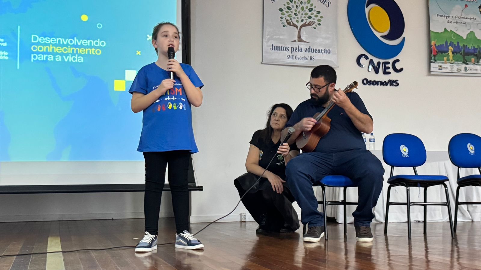A programação de abertura também incluiu a apresentação musical da estudante Sofia Guckert de Souza, da Escola Municipal Osvaldo Amaral, acompanhada pelo pai, Misael Silveira de Souza. Outro destaque foi a exibição de um vídeo produzido por alunos da rede municipal, no qual estudantes atípicos relataram suas vivências no ambiente escolar.