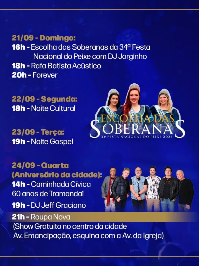 No domingo (21), ocorre a tradicional Escolha das Soberanas da 34ª Festa Nacional do Peixe, acompanhada de shows de Rafa Batista Acústico e da banda Forever. Já a segunda-feira (22) será marcada pela Noite Cultural, enquanto a terça-feira (23) contará com a Noite Gospel.