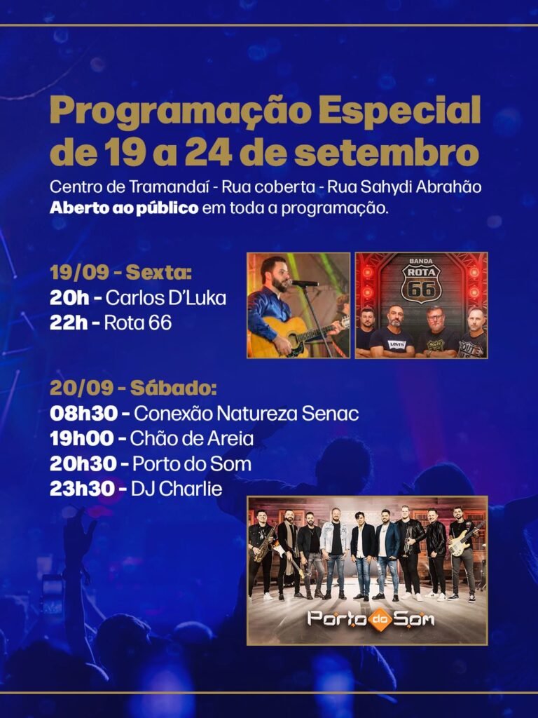 A programação inicia no dia 19, sexta-feira, com shows de Carlos D’Luka e da banda Rota 66. No sábado (20), estão previstas ações do projeto Conexão Natureza Senac, além das apresentações de Chão de Areia, Porto do Som e DJ Charlie.