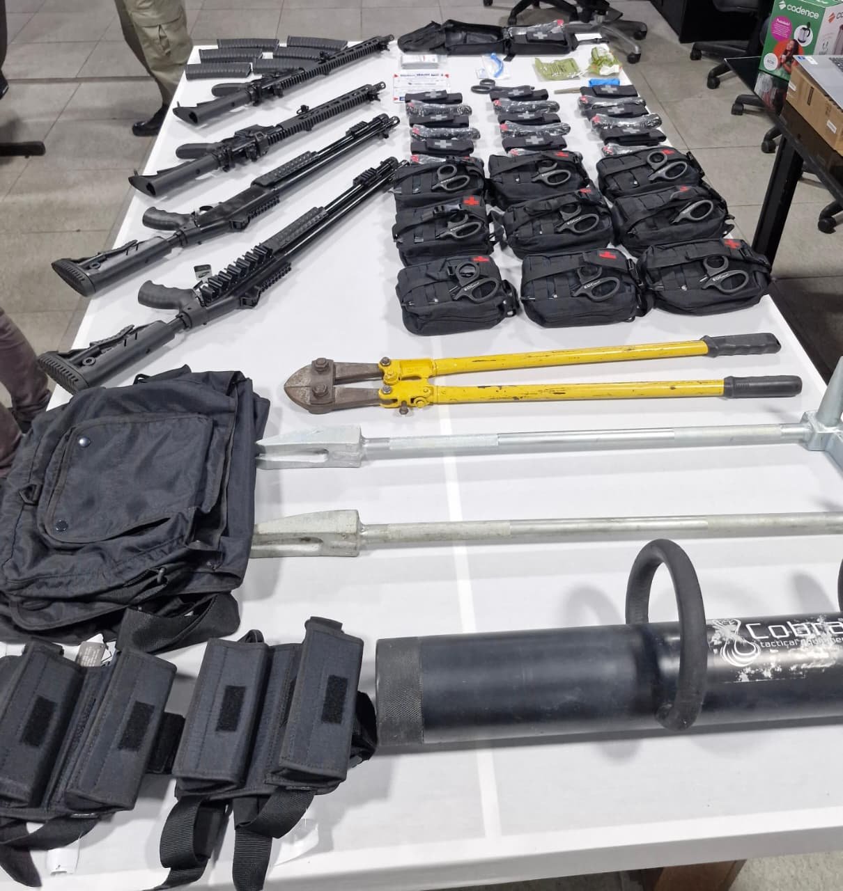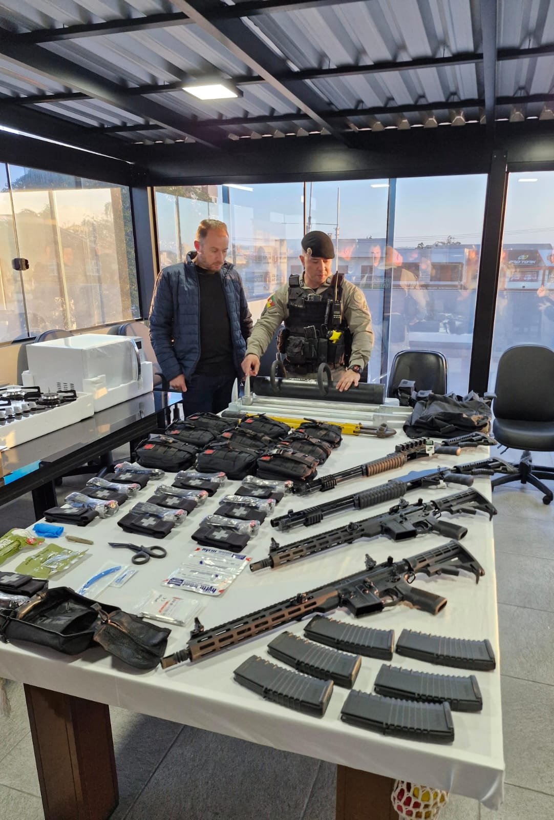 Entre os materiais entregues estão duas carabinas calibre 5,56, duas espingardas calibre 12, dez kits de primeiros socorros, um aríete tático, uma tesoura corta-vergalhão, duas alavancas de arrombamento, três bornais de granada e seis de munição calibre 12. Também foram repassados eletrodomésticos destinados ao uso interno da sala da Força Tática.