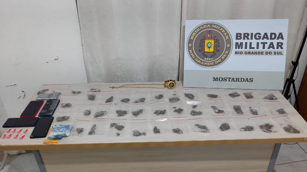 Em Mostardas, no bairro Vila Norte, um casal foi detido por tráfico de drogas após abordagem a um veículo Fiat/Uno, apontado pelo setor de inteligência como utilizado na entrega de entorpecentes. Durante a ação, os policiais apreenderam 42 porções de maconha, oito pinos de cocaína, quatro celulares, uma balança de precisão, dinheiro, televisores e outros objetos. O homem possui antecedentes por homicídio, tráfico e porte ilegal de arma restrita, enquanto a mulher já tinha passagens por tráfico.