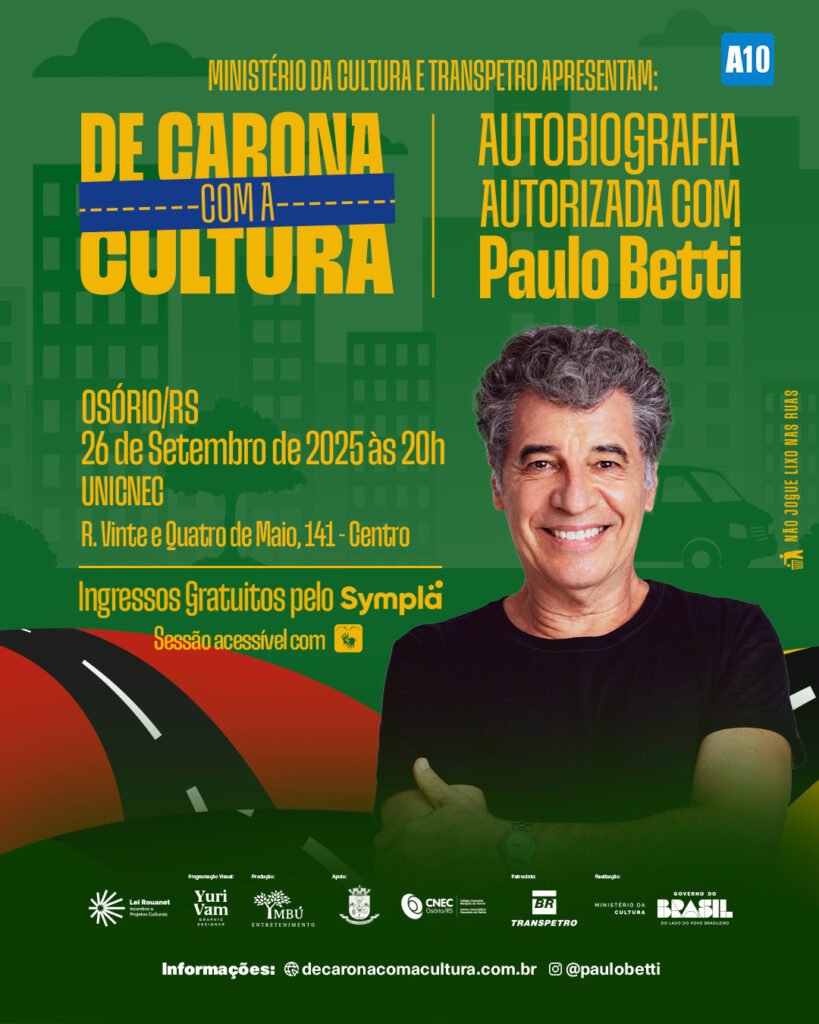 O ator Paulo Betti estará em Osório no próximo dia 26 de setembro para apresentar o espetáculo “Autobiografia Autorizada” e conduzir um workshop gratuito de interpretação para teatro e TV. A programação faz parte do projeto “De Carona com a Cultura”, patrocinado pela Transpetro por meio da Lei Rouanet, com apoio da Prefeitura de Osório.