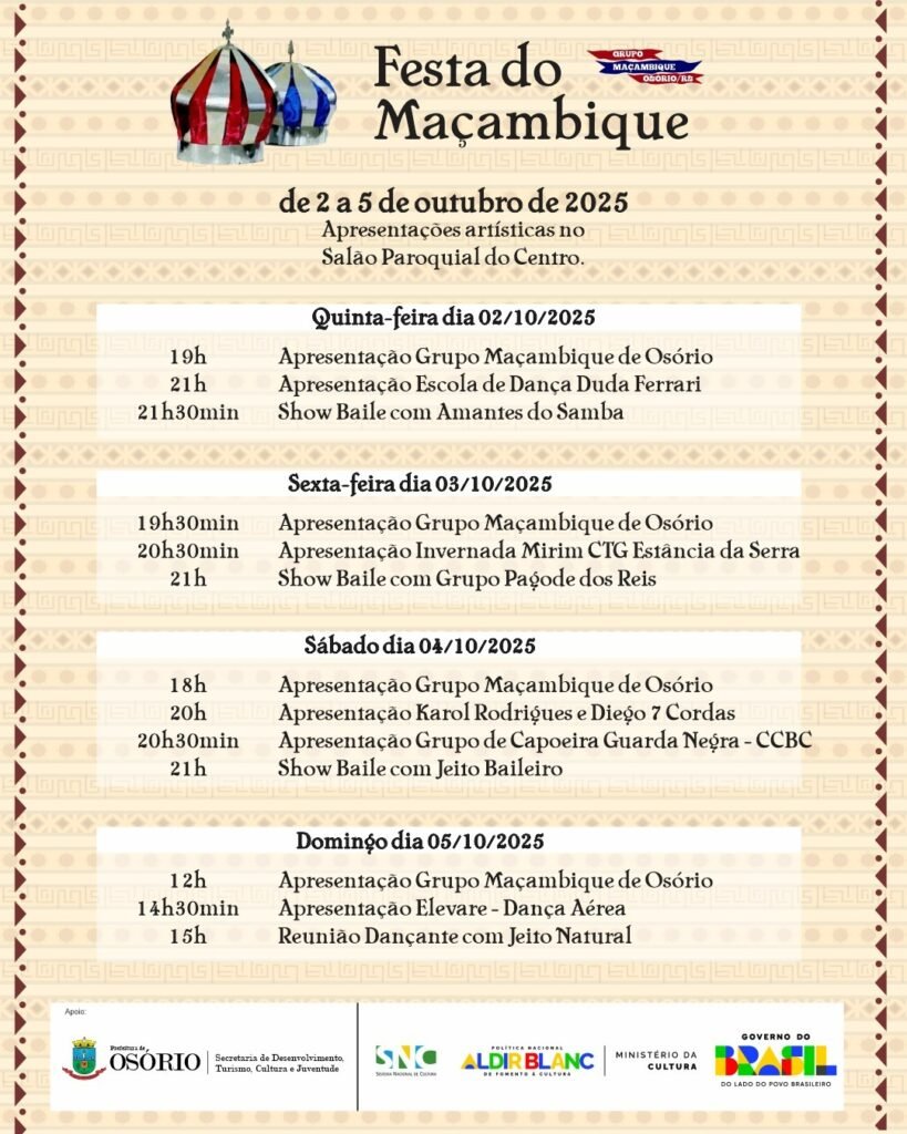 - Quinta-feira (02/10): Grupo Maçambique de Osório (19h), Escola de Dança Duda Ferrari (21h) e Show Baile com Amantes do Samba (21h30).