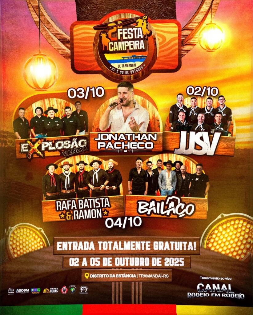 Entre os dias 2 e 5 de outubro, Tramandaí será palco da 2ª Festa Campeira, evento que reúne música, tradição e cultura gaúcha no Distrito da Estância. A programação inclui apresentações artísticas, atividades campeiras e atrações musicais, todas com acesso gratuito ao público.