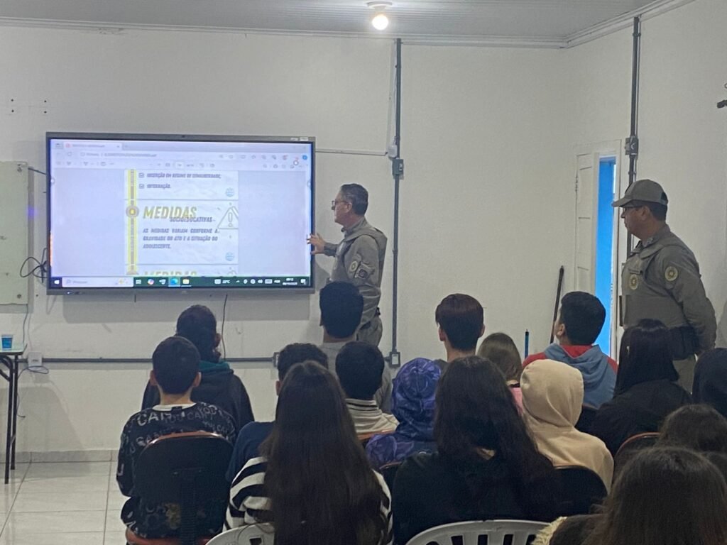 Durante a atividade, os policiais abordaram temas relacionados aos direitos e deveres dos adolescentes, enfatizando o papel da Patrulha Escolar no ambiente educacional e na construção de um convívio harmonioso entre escola, estudantes e comunidade.