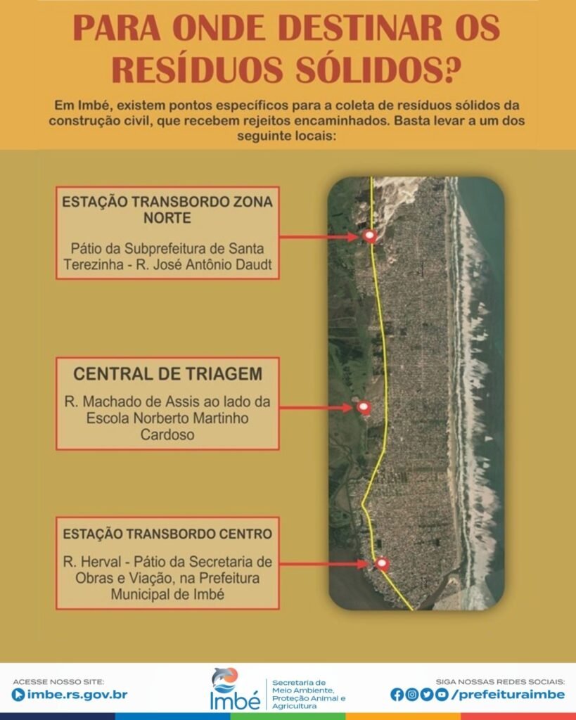 A secretaria orienta que o descarte de entulhos e resíduos volumosos deve ser feito em um dos três pontos licenciados de coleta disponíveis no município. O serviço é gratuito para volumes de até 1 metro cúbico, equivalente a uma caçamba de caminhonete. Em relação ao esgoto, é necessário manter sistemas hidrossanitários adequados, com fossa, filtro e sumidouro.