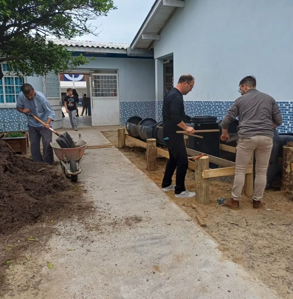 A ação envolveu alunos, professores e servidores da escola no preparo do solo, plantio e organização dos canteiros, permitindo aprendizado prático sobre produção de alimentos e sustentabilidade.