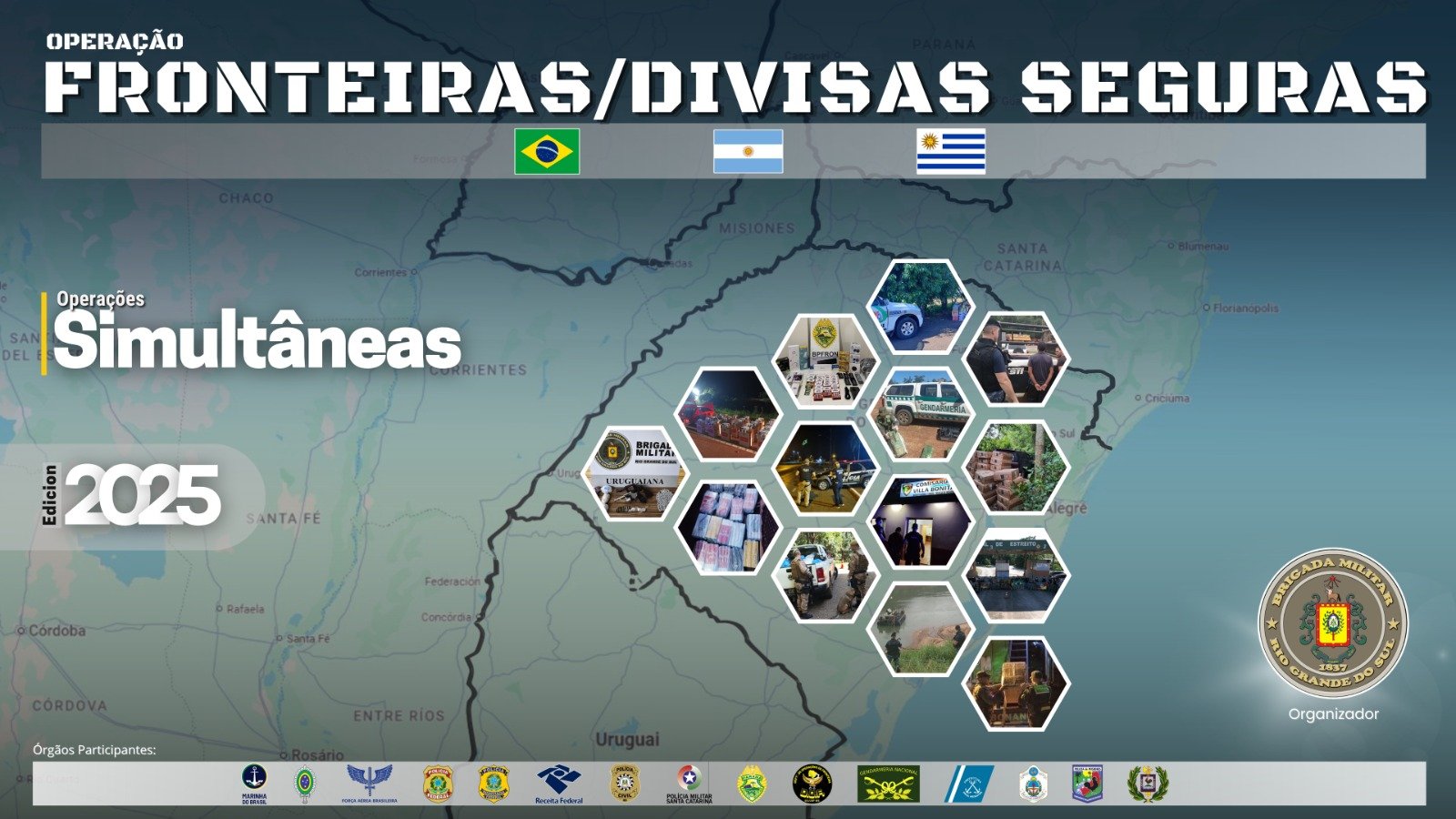 A Brigada Militar do Rio Grande do Sul deu início, na manhã desta terça-feira (4/11), à Operação Fronteiras e Divisas Seguras, uma ação integrada entre forças de segurança estaduais, federais e internacionais com foco no combate a crimes transfronteiriços. No Litoral Norte, o lançamento ocorreu em Torres, reunindo representantes da Polícia Militar de Santa Catarina, Polícia Civil, Polícia Rodoviária Federal (PRF) e autoridades locais.