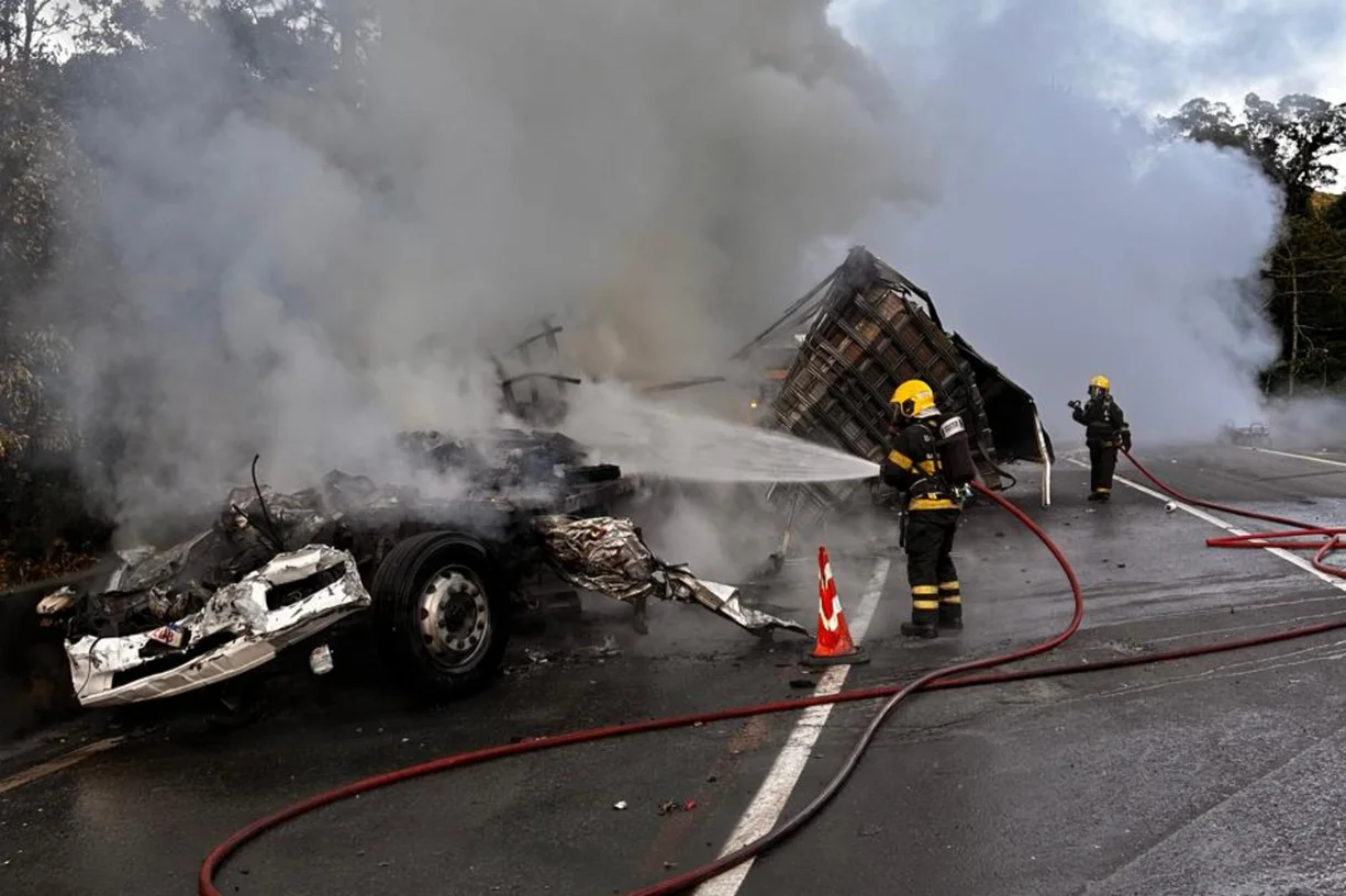 Um grave acidente na manhã desta quarta-feira (12) provocou o bloqueio total da BR-376, em Guaratuba, no litoral do Paraná. A colisão, registrada por volta das 5h, envolveu dois caminhões e uma van que transportava uma família com crianças rumo ao parque Beto Carrero World, em Penha (SC).
