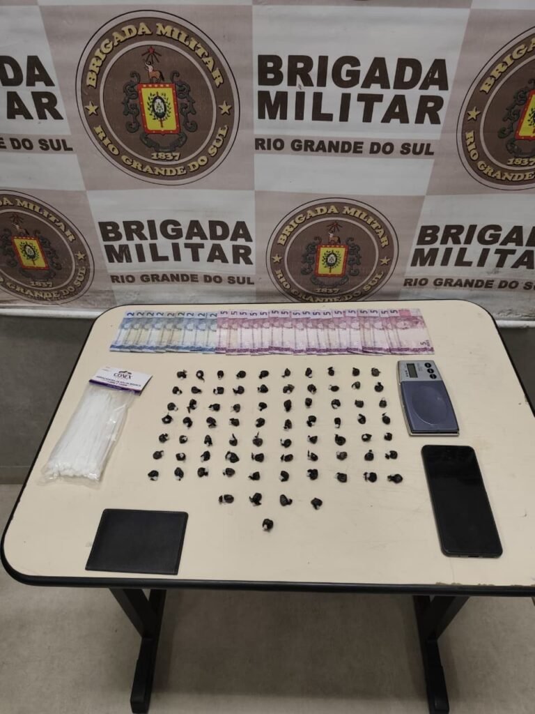 Ainda conforme a Brigada Militar, também foram apreendidos R$ 103 em dinheiro trocado e um pacote de abraçadeiras plásticas. O suspeito, que possui antecedentes por tráfico de drogas, foi preso em flagrante e encaminhado à delegacia para o registro da ocorrência.