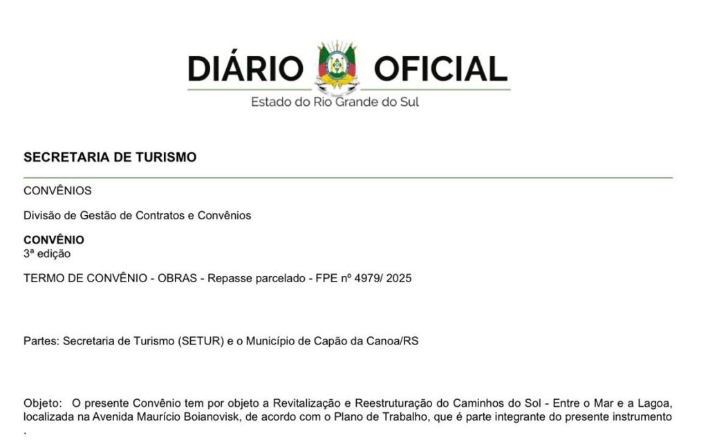 O Governo do Rio Grande do Sul confirmou a assinatura de um convênio com o município de Capão da Canoa para a revitalização e reestruturação do trecho Caminhos do Sol – Entre o Mar e a Lagoa, localizado na Avenida Maurício Boianovisk, conhecida como Avenida Central. A via é um dos principais pontos de acesso ao município e considerada a principal entrada da cidade. O acordo foi publicado nesta terça-feira (30) no Diário Oficial do Estado, por meio da Secretaria Estadual de Turismo, e anunciado em reunião com lideranças do município.