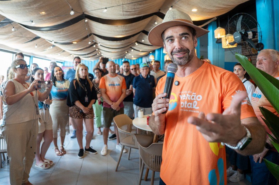 O governador do Rio Grande do Sul, Eduardo Leite, participou neste sábado (10) da abertura da Casa de Verão do Sindicato das Empresas de Transportes